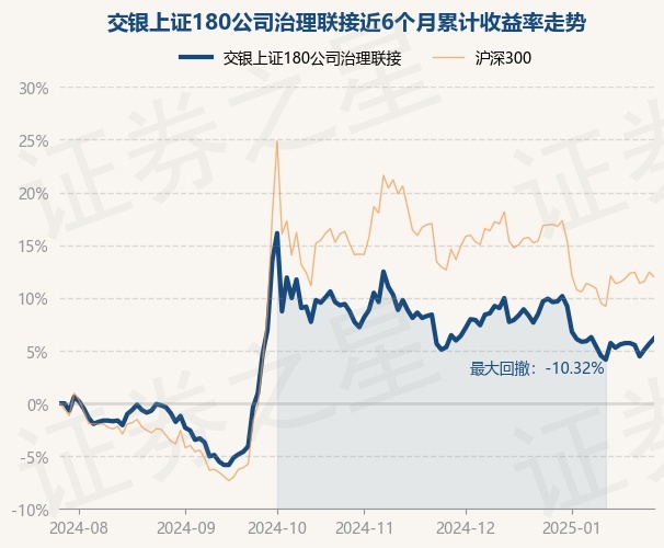 本站消息,1月27日,交银上证180公司治理联接最新单位净值为1.691元,累计净值为1.691元,较前一交易日上涨0.48%。历史数据显示该基金近1个月下跌3.21%,近3个月下跌2.87%,近6个月上涨6.15%,近1年上涨13.57%。该基金近6个月的累计收益率走势如下图: